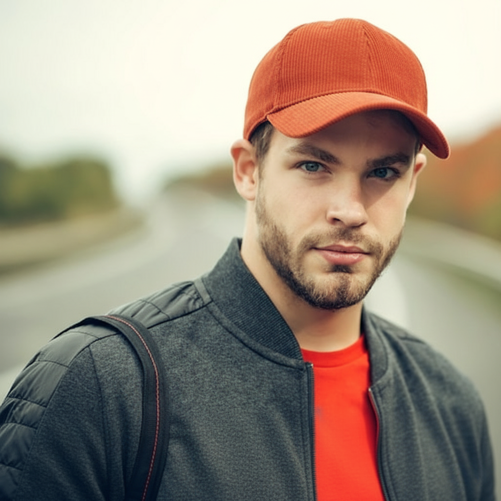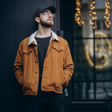 Embrace cozy vibes with a mustard corduroy jacket, paired with a neutral sweater and dark cap. Perfect for those laid-back days when style and comfort come together seamlessly.