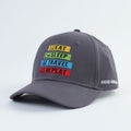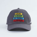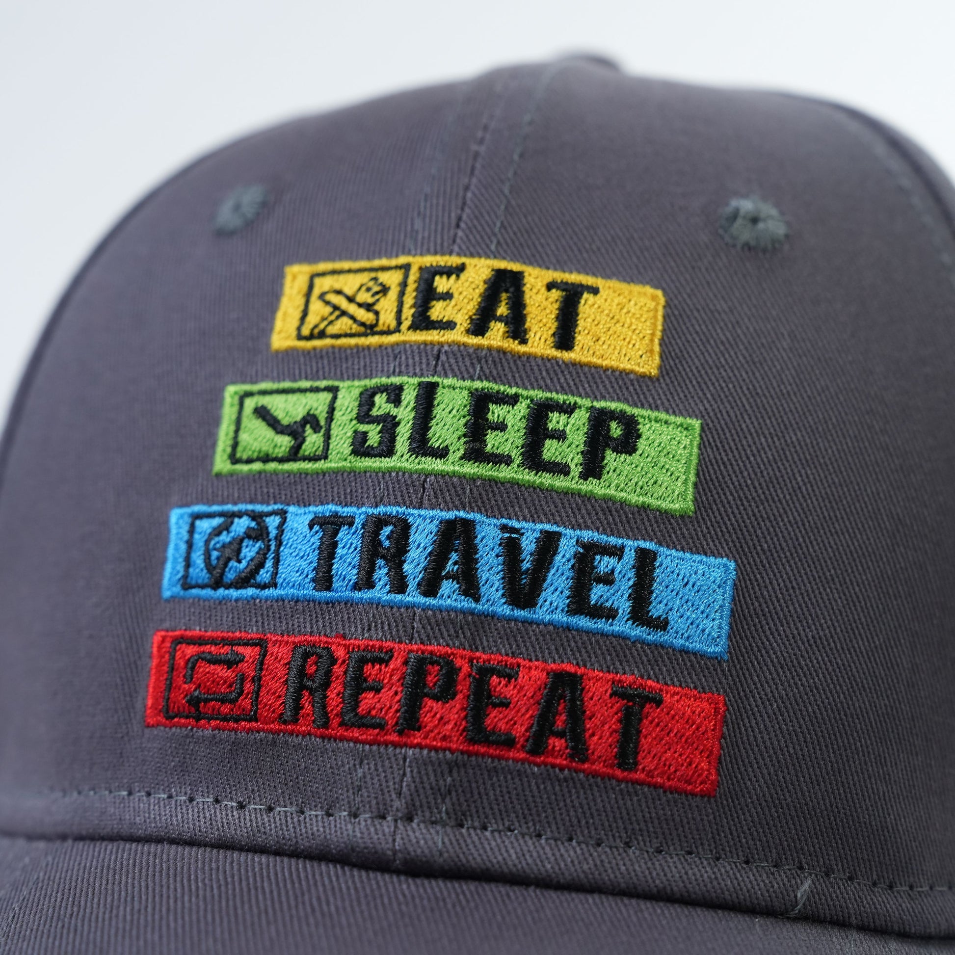 Celebrate your lifestyle with the Head Gear AU “Eat Sleep Travel Repeat” Cap – a fun and expressive design for those who live on the move. Crafted from durable grey cotton, this cap features bold, colorful embroidery on the crown that reads “EAT, SLEEP, TRAVEL, REPEAT” stacked in vibrant blocks of yellow, blue, green, and red.