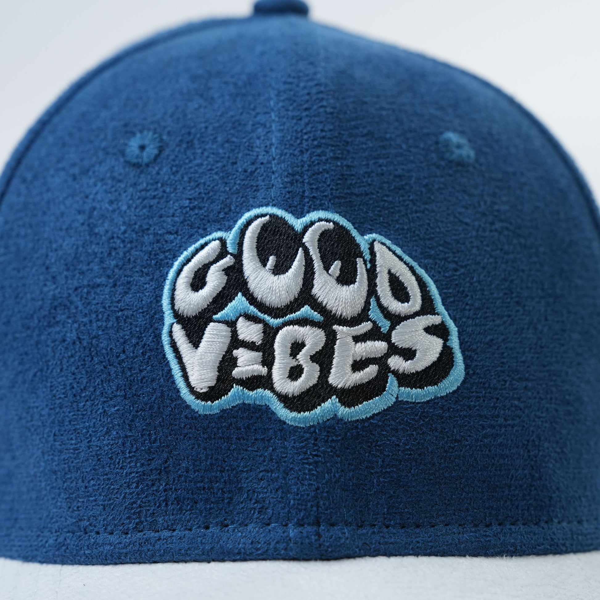 - Design: Embroidered “GOOD VIBES” text in bubble font, bold and playful.