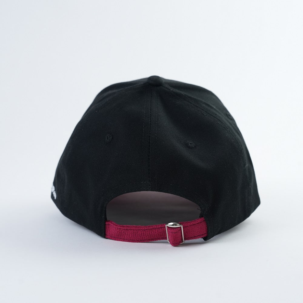 - Material: Black cotton crown with red suede visor.